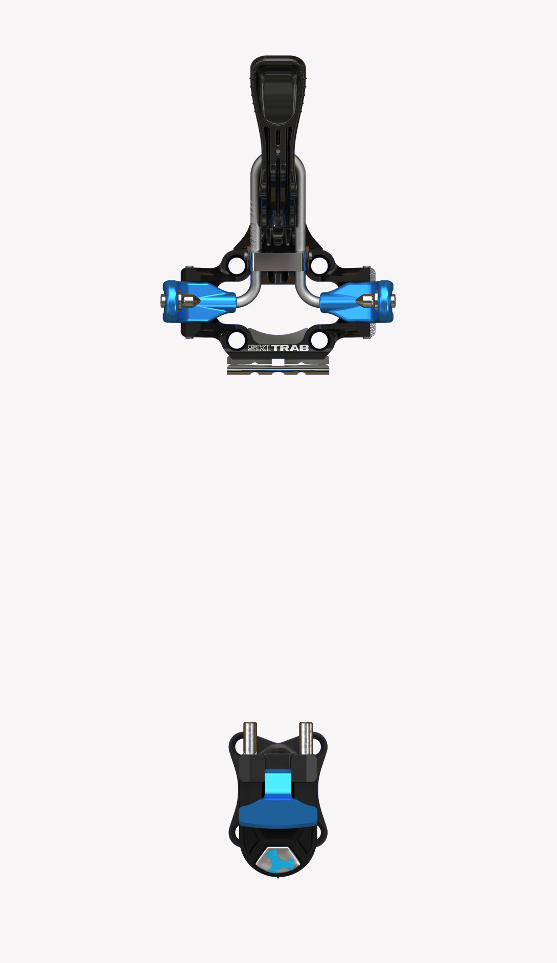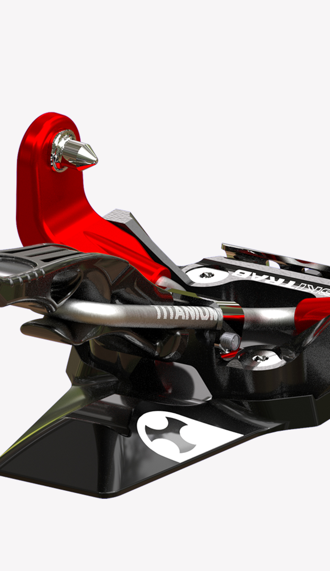 One simple component in titanium specially designed in its shape and structure links the two jaws in the toe unit. This extremely simple mechanism offers a significant guarantee of functionality and reliability. The toe unit jaws open with a light pressure on the front lever, which can be pressed either by hand or with a ski pole. Position the boot so that the jaw pins are level with the holes on the side of the boot, then release the lever so the jaws close locking the toe of the boot into place. Rotate the lever upwards to block the opening of the jaws. This special elastic component in titanium permits the toe unit to adapt perfectly to all types of boots, guarantees that the boot remains fixed in place and with the help of some particularly well finished and crafted pins it can clean out the boot inserts during use.